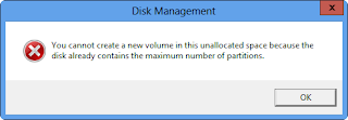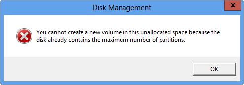 As we know, Windows Disk Management tool can help us to create new partitions when we need. However, sometimes, we may fail to create a new partition. To be specific, I’m planning to create a new partition to store some personal data by using Disk Management tool. Therefore, I shrink one of my partitions to get unallocated space, and then create a new one with it. Nevertheless, I receive a message: “You cannot create a new volume in this unallocated space because the disk already contains the maximum number of partitions”. What’s the reason and how do I fix this issue?