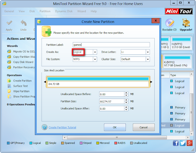 Note: you are not allowed to create a logical partition between 2 primary partitions via this professional freeware. Under this situation, you can turn to the “Move/Resize Partition” to change the position between primary partition and unallocated space.